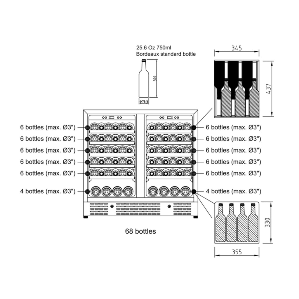 68 bottles (750ml, up to 86mm dia.)