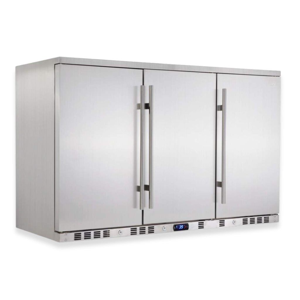 Equipped with a Carel digital temperature controller and a high-efficiency Embraco compressor, this cooler ensures precise temperature control, consistent cooling, and energy savings. Its front-venting system allows for seamless built-in or freestanding installation, while three solid stainless steel doors keep your beverages perfectly chilled and protected from sunlight and outdoor elements.